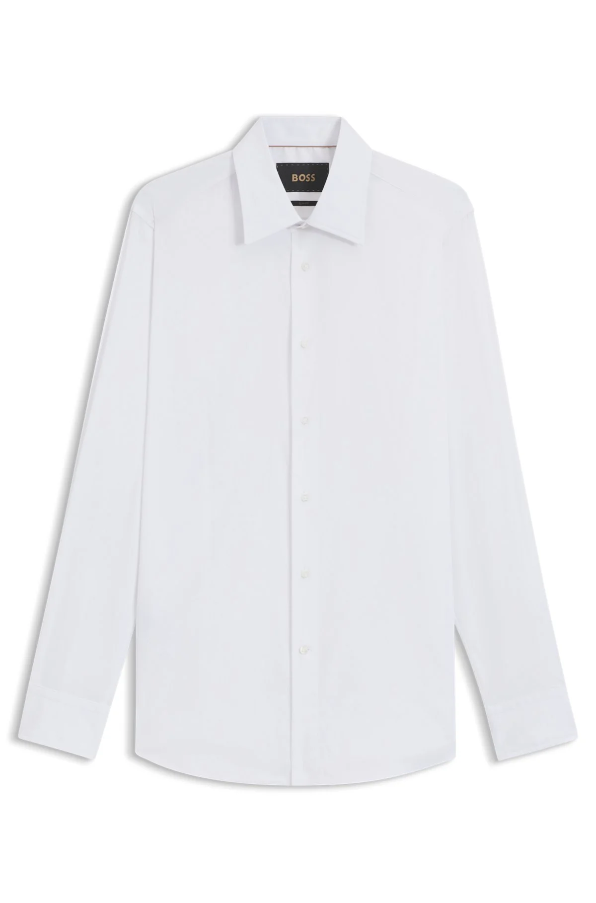SIZE AND FIT The model wears a size EU:40 and is 6'1" tall with a, 36" chest, 29" waist and 36" hips. DETAILS L-HAYS-KENT-C1-243 - 50544772 With its clean slim fit and performance stretch, this BOSS Menswear shirt is a fine choice for business travel. Finest Italian-made cotton. Slim fit Kentkragen Angled cuffs QUALITY & CARE INSTRUCTIONS Iron Medium Heat Machine Wash Warm Dry Clean Only Do Not Tumble Dry Do Not Bleach Quality: 76% Cotton, 21% Polyamid, 3% Elastane