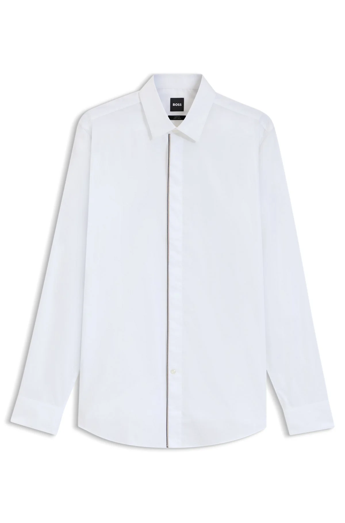 SIZE AND FIT The model wears a size EU:40 and is 6'1" tall with a, 33" chest, 31" waist and 33" hips. DETAILS H-HANK-party7-253 - 50545158 With its clean fit and easy-iron finish, this BOSS Menswear shirt is a business must. In poplin with a placket trim in signature colors. Please note that the white colorway – made from cotton woven in Austria – has a special finish that holds its brilliance for an extra-white look, wash after wash. Slim fit Kentkragen Round cuffs QUALITY & CARE INSTRUCTIONS Do Not Tumble Dry Quality: 100% Cotton Machine Wash Warm Iron Medium Heat Do Not Bleach Dry Clean Only