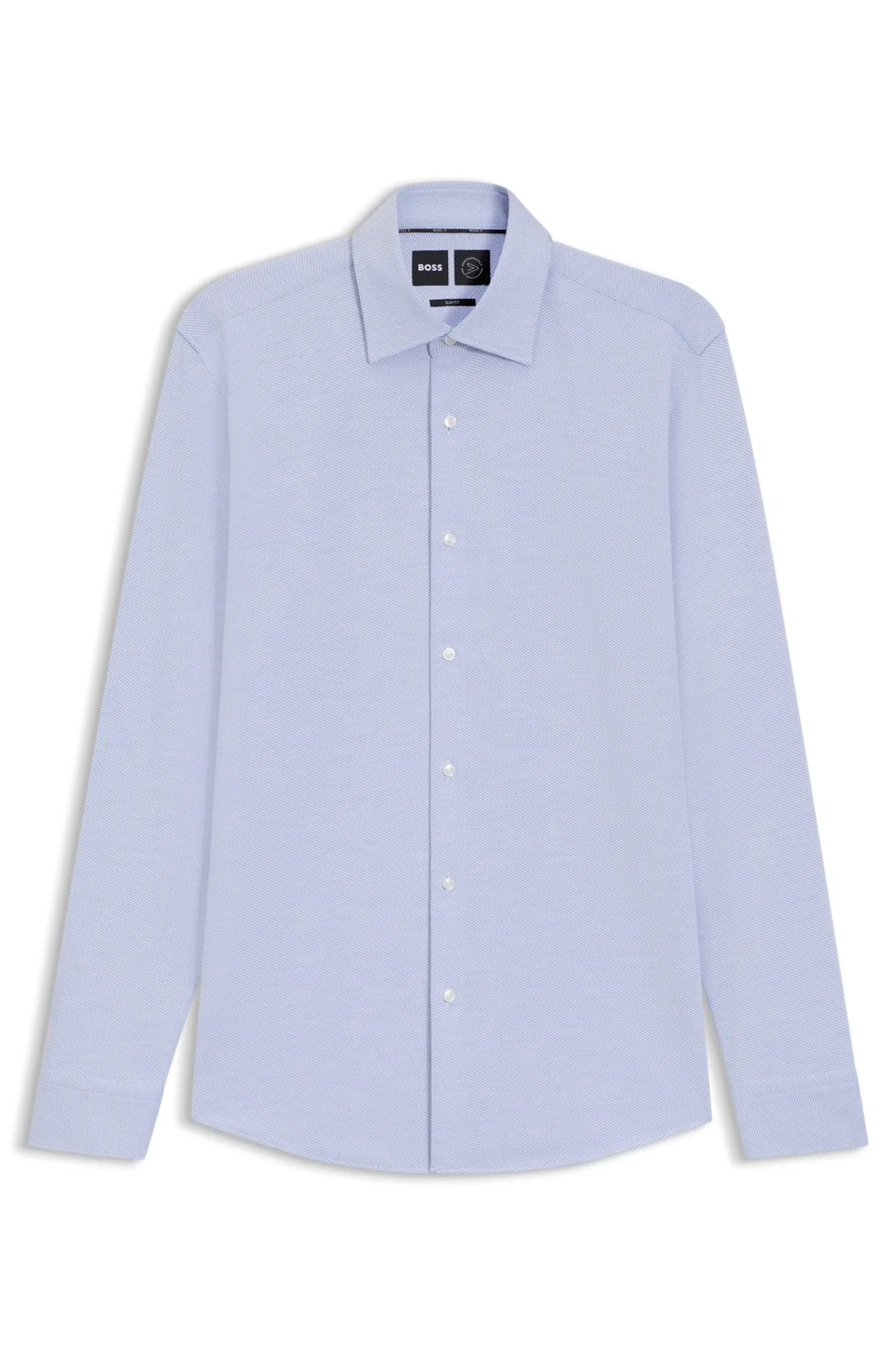 SIZE AND FIT The model wears a size 15.5 and is 6'1" tall with a, 37" chest, 29" waist and 35" hips. DETAILS In cotton jersey for everyday comfort, this BOSS Menswear shirt is the ideal business piece. Tailored to a clean slim fit. Modern pattern. Slim fit Kentkragen Round cuffs P-HANK-kent-C1-222 - 50550565 QUALITY & CARE INSTRUCTIONS Material: 59% Cotton, 41% Polyester Do Not Tumble Dry Do Not Bleach Dry Clean Only Iron Low Heat Machine Wash Cold Gentle