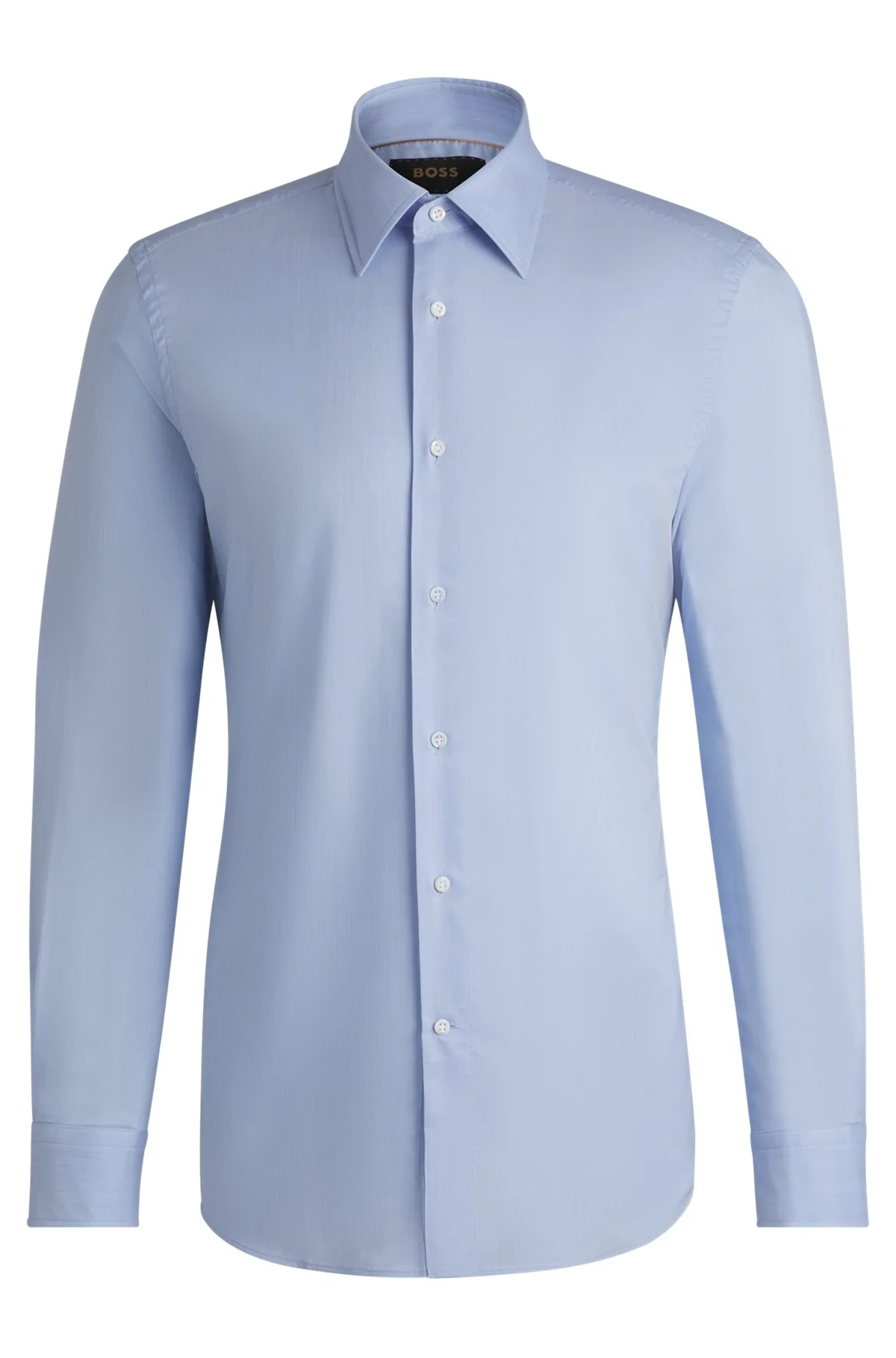 SIZE AND FIT The model wears a size EU:40 and is 6'1" tall with a, 33" chest, 24" waist and 36" hips. DETAILS L-HAYS-KENT-C1-243 - 50528362 A timeless business shirt, offering luxury performance with advanced stretch, by BOSS. The slim fit delivers a clean and contemporary profile. Slim fit Kent collar Angled cuffs QUALITY & CARE INSTRUCTIONS Iron Medium Heat Dry Clean Only Quality: 57% Lyocell, 43% Elastomultiester Do Not Tumble Dry Machine Wash Cold Do Not Bleach