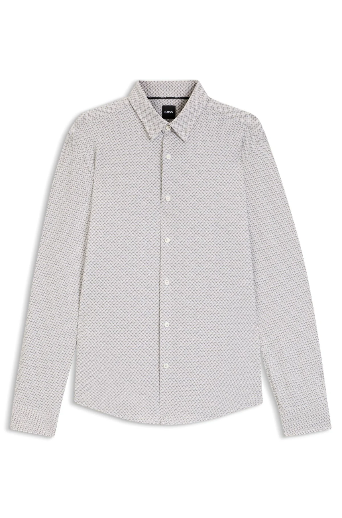 SIZE AND FIT The model wears a size M and is 6'1" tall with a, 37" chest, 29" waist and 35" hips. DETAILS Offering stretch comfort and moisture management, this BOSS Menswear shirt has a contemporary print. Italian fabric. Cut to a clean slim fit. Slim fit Kentkragen Round cuffs Standard length P-ROAN-kent-C1-233 - 50550734 QUALITY & CARE INSTRUCTIONS Iron Low Heat Dry Clean Only Do Not Tumble Dry Material: 87% Polyamide, 13% Elastane Do Not Bleach Machine Wash Cold Gentle