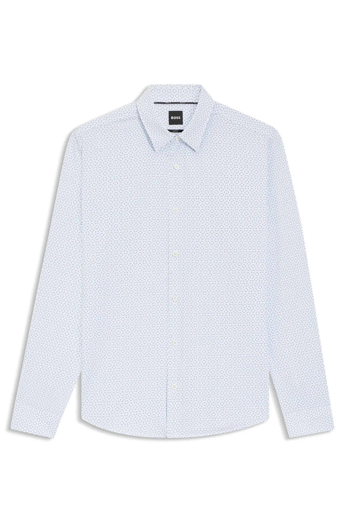 DETAILS Offering stretch comfort and moisture management, this BOSS Menswear shirt has a contemporary print. Italian fabric. Cut to a clean slim fit. Slim fit Kentkragen Round cuffs Standard length P-ROAN-kent-C1-233 - 50550734 QUALITY & CARE INSTRUCTIONS Machine Wash Cold Gentle Do Not Bleach Quality: 87% Polyamide, 13% Elastane Iron Low Heat Dry Clean Only Do Not Tumble Dry