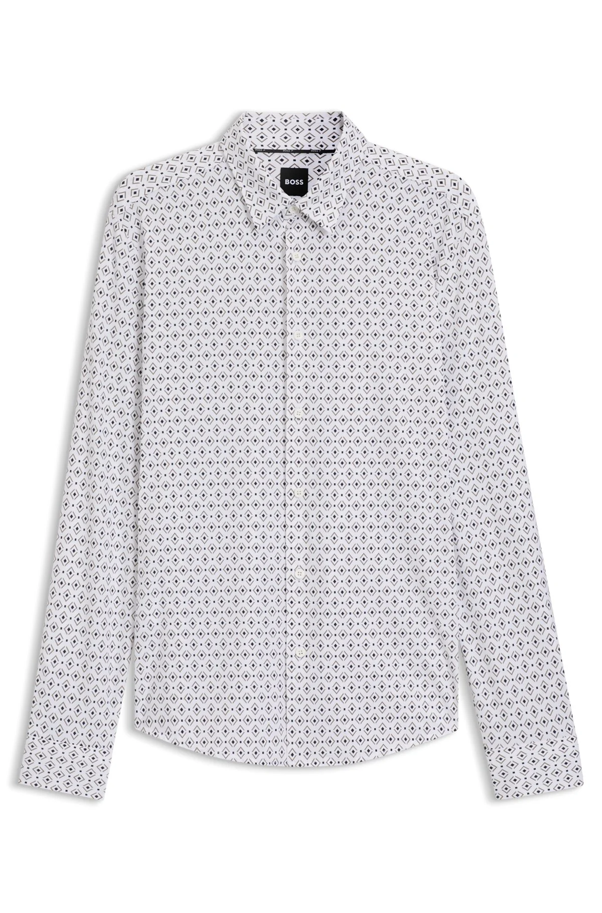 SIZE AND FIT The model wears a size M and is 6'1" tall with a, 37" chest, 29" waist and 35" hips. DETAILS P-ROAN-kent-C1-233 - 50550734 Offering stretch comfort and moisture management, this BOSS Menswear shirt has a contemporary print. Italian fabric. Cut to a clean slim fit. Slim fit Kentkragen Round cuffs Standard length QUALITY & CARE INSTRUCTIONS Quality: 87% Polyamide, 13% Elastane Do Not Tumble Dry Machine Wash Cold Gentle Iron Low Heat Do Not Bleach Dry Clean Only