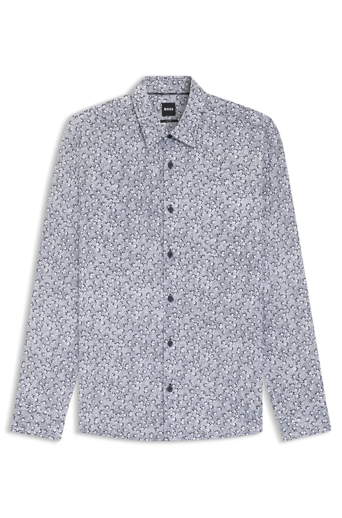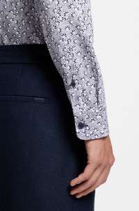DETAILS In cotton-rich jersey for performance comfort, this BOSS Menswear shirt has a modern print that's easy to style. Contemporary slim fit. Slim fit Kentkragen Round cuffs Standard length P-ROAN-kent-C1-233 - 50550722 QUALITY & CARE INSTRUCTIONS Machine Wash Cold Gentle Do Not Bleach Quality: 75% Cotton, 25% Polyester Iron Low Heat Dry Clean Only Do Not Tumble Dry