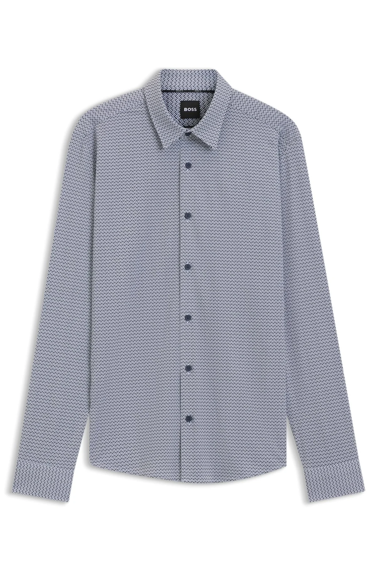 DETAILS Offering stretch comfort and moisture management, this BOSS Menswear shirt has a contemporary print. Italian fabric. Cut to a clean slim fit. Slim fit Kentkragen Round cuffs Standard length P-ROAN-kent-C1-233 - 50550734 QUALITY & CARE INSTRUCTIONS Dry Clean Only Do Not Tumble Dry Iron Low Heat Do Not Bleach Material: 87% Polyamide, 13% Elastane Machine Wash Cold Gentle