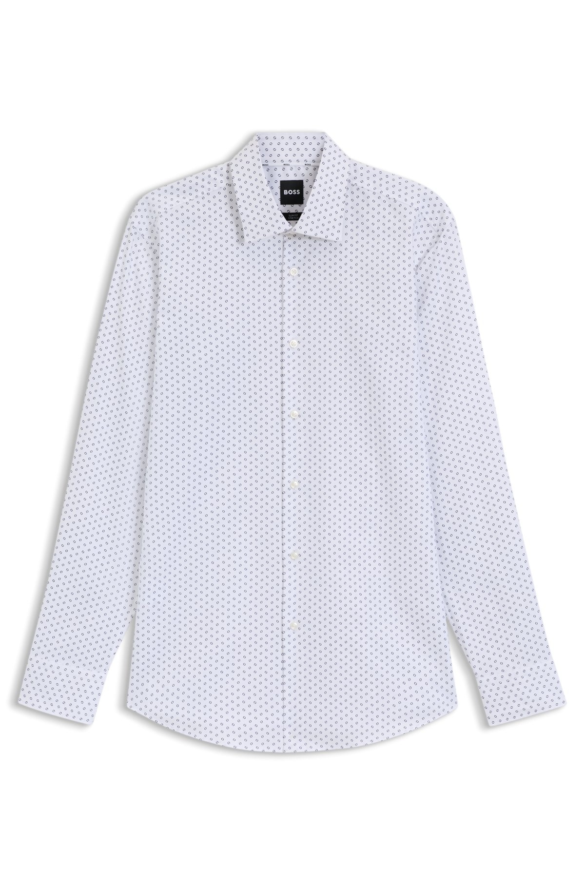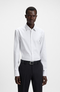 SIZE AND FIT The model wears a size EU:40 and is 6'1" tall with a, 33" chest, 31" waist and 33" hips. DETAILS H-HANK-kent-C1-214 - 50545102 With a geometric print on an Oxford base, this BOSS Menswear business shirt is an instant classic. Stretch-cotton blend. Defined fit. Slim fit Kent collar Round cuffs QUALITY & CARE INSTRUCTIONS Do Not Bleach Iron Medium Heat Quality: 98% Cotton, 2% Elastane Machine Wash Warm Dry Clean Only Do Not Tumble Dry