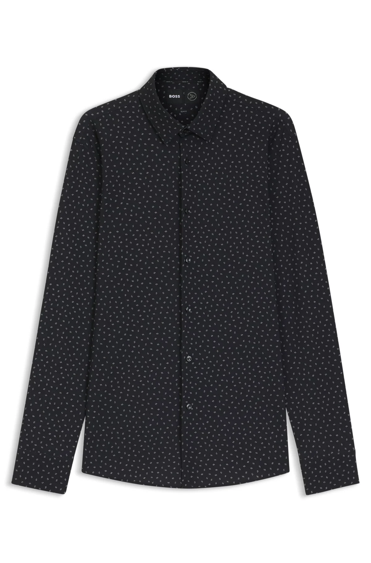 DETAILS P-HANK-s-kent-C1-222 - 50545306 In super-flex jersey for comfort and movement, this BOSS Menswear shirt is a business essential. Tailored to a clean fit. Contemporary print. Slim fit Kent collar Round cuffs QUALITY & CARE INSTRUCTIONS Iron Low Heat Do Not Bleach Dry Clean Only Quality: 76% Polyamid, 24% Elastane Do Not Tumble Dry Machine Wash Cold Gentle
