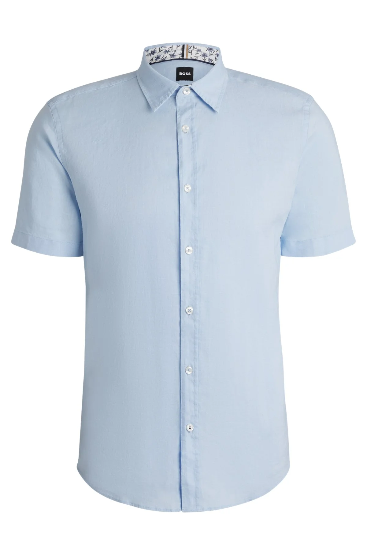 SIZE AND FIT The model wears a size L and is 6'2" tall with a, 37" chest, 28" waist and 36" hips. DETAILS C-ROAN-ken-SH-C3-252 - 50539569 With contrast material internally, this BOSS Menswear shirt is essential for the summer. Cut to a slim fit in a flexible linen blend. Slim fit Kent collar Round cuffs QUALITY & CARE INSTRUCTIONS Dry Clean Only Do Not Bleach Iron Low Heat Quality: 85% Linen, 15% Elastomultiester Machine Wash Cold Do Not Tumble Dry