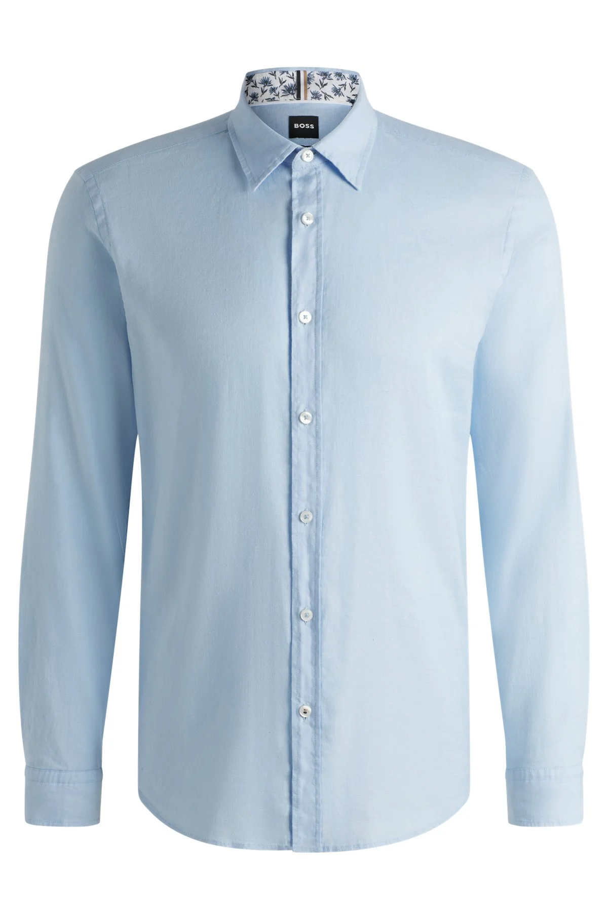 SIZE AND FIT The model wears a size L and is 6'2" tall with a, 36" chest, 28" waist and 37" hips. DETAILS C-ROAN-kent-C3-252 - 50546305 A must-have for the summer, this BOSS Menswear shirt is crafted in stretch linen for cooling comfort with freedom of movement. Modern slim fit. Slim fit Kent collar Round cuffs QUALITY & CARE INSTRUCTIONS Dry Clean Only Iron Low Heat Machine Wash Cold Do Not Tumble Dry Quality: 85% Linen, 15% Elastomultiester Do Not Bleach
