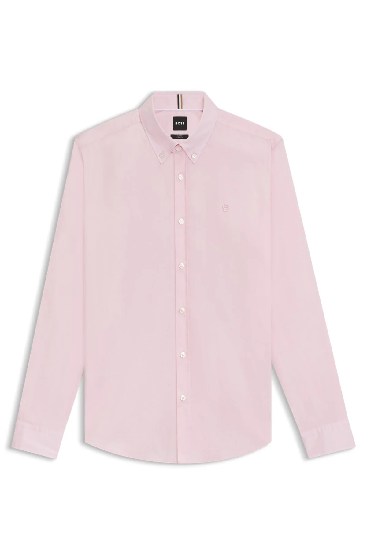 DETAILS With a Double B monogram, this BOSS Menswear business shirt is an instant classic. Cut to a slim fit in satin with stretch. Slim fit Button-down collar Round cuffs H-ROAN-BD-E-C1-253 - 50545234 QUALITY & CARE INSTRUCTIONS Dry Clean Only Iron Low Heat Do Not Tumble Dry Machine Wash Warm Gentle Do Not Bleach Material: 72% Cotton, 24% Polyamid, 4% Elastane