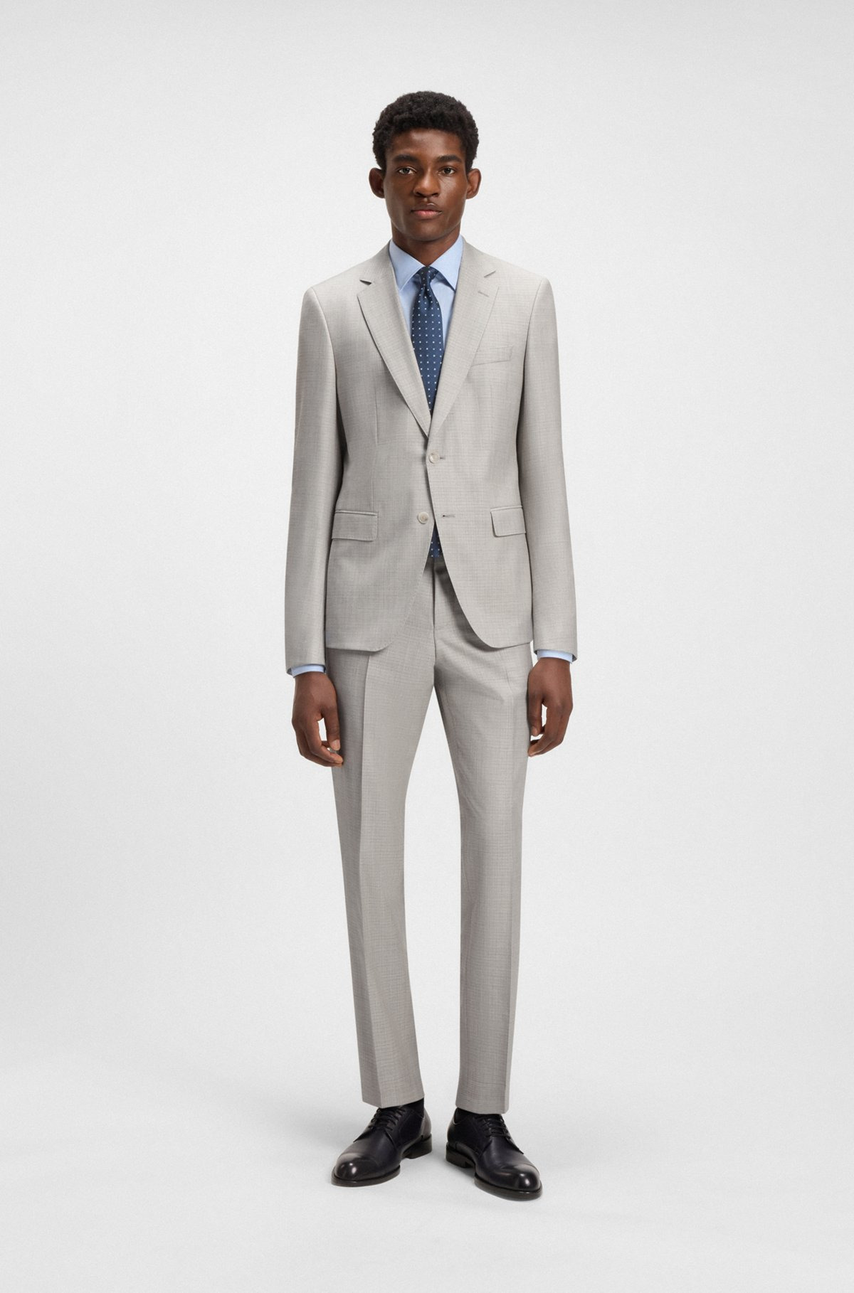SIZE AND FIT The model wears a size 38R and is 6'2" tall with a, 37" chest, 33" waist and 35" hips. DETAILS H-Huge-2Pcs-253 - 50546116 Achieve a clean profile in this BOSS Menswear suit, tailored to a defined fit with constructed shoulders. Woven with a subtle pattern for versatile styling, this suit is crafted in virgin wool blended with silk for a luxurious feel. AMF stitching adds a refined touch to this expertly crafted ensemble. Slim fit Notched lapels Number of buttons: 2 Pockets top: Flap pockets Kissing buttons on the cuff Fully lined Hook and zip closure Pockets bottom front: Side slash pockets Pockets bottom back: Welt pocket QUALITY & CARE INSTRUCTIONS Reduced Dry Clean Do Not Bleach Do Not Tumble Dry Do Not Wash Iron Low Heat Quality: 80% Virgin wool, 20% Silk, Lining: 65% Viscose, 35% Polyester, Sleeve lining: 100% Viscose, knee lining: 100% Viscose
