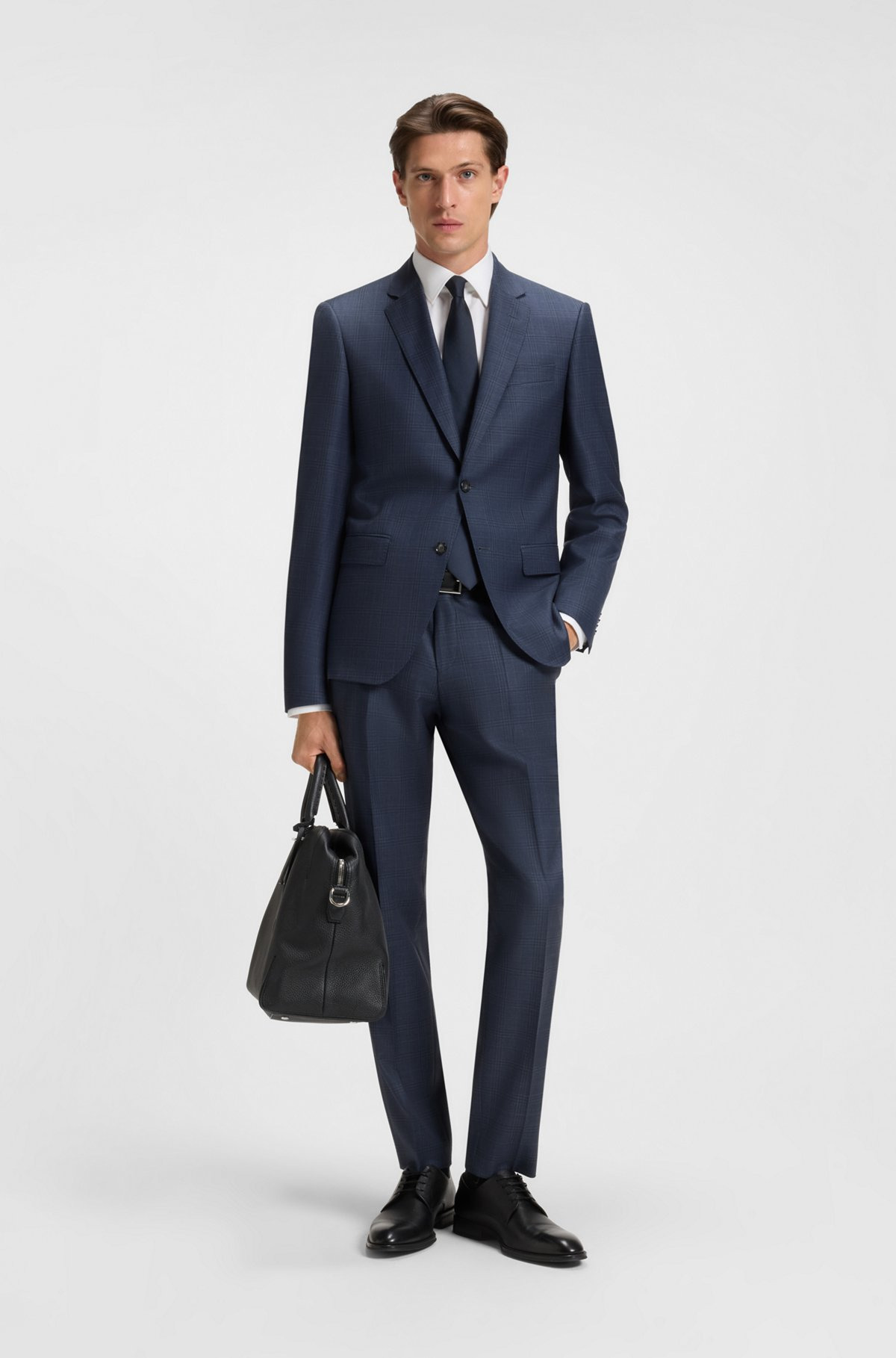 DETAILS H-Huge-2Pcs-253 - 50551812 With its neat profile and constructed shoulders, this BOSS Menswear suit is a solid formal choice. Tailored to a defined fit, this two-piece suit is crafted in wool to bring you natural stretch and breathable comfort. A heritage check emphasizes the timeless elegance of this ensemble. Slim fit Notched lapels Number of buttons: 2 Jetted chest pockets Pockets top: Flap pockets Kissing buttons on the cuff Fully lined Packaging: Dust bag QUALITY & CARE INSTRUCTIONS Do Not Tumble Dry Quality: 100% Virgin wool, Lining: 100% Viscose, Sleeve lining: 100% Viscose, knee lining: 100% Viscose Reduced Dry Clean Iron Medium Heat Do Not Wash Do Not Bleach