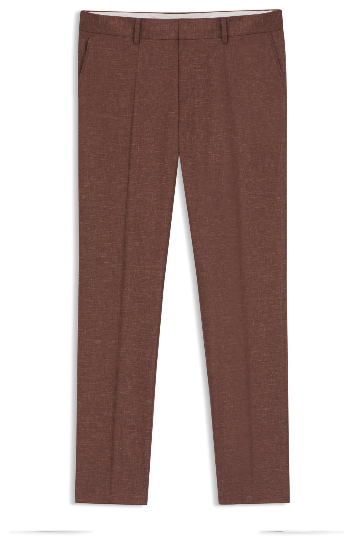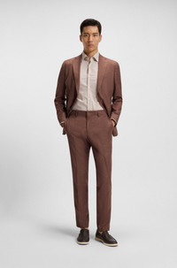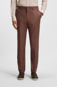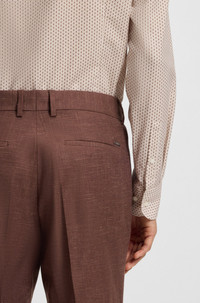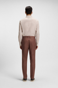 DETAILS H-Genius-253 - 50546003 With virgin wool, cotton and linen, these super-stretch BOSS Menswear trousers make a versatile building block. Cut to a clean slim fit. Slim fit Hook and zip closure Pockets bottom front: Side pockets Pockets bottom back: Welt pocket Partially lined QUALITY & CARE INSTRUCTIONS Do Not Wash Reduced Dry Clean Do Not Tumble Dry Do Not Bleach Quality: 35% Virgin wool, 30% Cotton, 26% Viscose, 7% Linen, 2% Elastane, pocketing: 65% Polyester, 35% Cotton, knee lining: 100% Viscose Iron Low Heat
