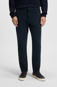 SIZE AND FIT The model wears a size 32/32 and is 6'1" tall with a, 36" chest, 29" waist and 36" hips. DETAILS H-Kaiton1 - 50543312 In stretch-cotton twill with a softly brushed finish, these BOSS Menswear trousers are a great casual building block. Contemporary slim fit. Slim fit Regular rise Button and zip closure Pockets bottom front: French pocket Pockets bottom back: Welt pocket QUALITY & CARE INSTRUCTIONS Reduced Dry Clean Machine Wash Cold Gentle Do Not Tumble Dry Quality: 95% Cotton, 5% Elastane Do Not Bleach Iron Low Heat