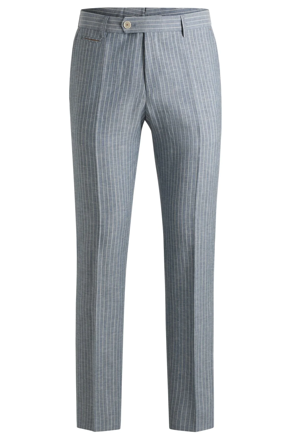 SIZE AND FIT The model wears a size 32R and is 6'2" tall with a, 35" chest, 29" waist and 35" hips. DETAILS L-Gee-Detail-243 - 50539449 With a subtle summery stripe for versatile styling, these BOSS Menswear trousers are crafted in a breathable wool-linen blend. Tailored to a defined fit. Slim fit QUALITY & CARE INSTRUCTIONS Do Not Tumble Dry Quality: 53% Virgin wool, 47% Linen, Trouser: 100% Cotton, pocketing: 100% Cotton, knee lining: 100% Viscose Do Not Bleach Iron Medium Heat Reduced Dry Clean Do Not Wash