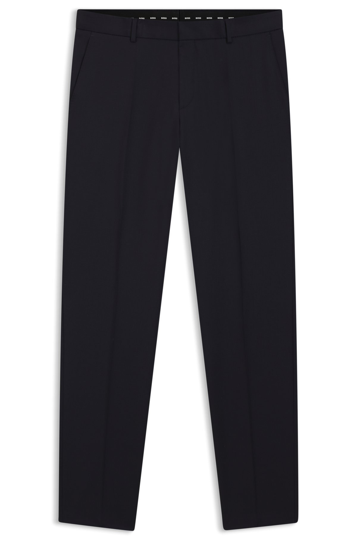 SIZE AND FIT The model wears a size 32R and is 6'2" tall with a, 35" chest, 30" waist and 36" hips. DETAILS H-Genius-B1 - 50469174 Cut a precise figure in these formal BOSS Menswear trousers. Crafted in finest wool with a serge weave and natural stretch for comfort. Slim fit. Slim fit Hook and zip closure Crease Pockets bottom front: French pocket Pockets bottom back: Jetted pockets QUALITY & CARE INSTRUCTIONS Reduced Dry Clean Do Not Bleach Do Not Tumble Dry Iron Medium Heat Do Not Wash Quality: 100% Virgin wool, pocketing: 65% Polyester, 35% Cotton, knee lining: 100% Viscose