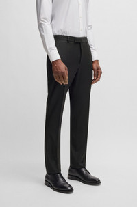 SIZE AND FIT The model wears a size 34R and is 6'1" tall with a, 36" chest, 29" waist and 37" hips. DETAILS L-Glover-241-LC - 50509898 Refined slim-fit trousers by BOSS Menswear. This pair is crafted in fabric blended with stretch for comfort in movement. Slim fit QUALITY & CARE INSTRUCTIONS Quality: 98% Virgin wool, 2% Elastane, pocketing: 100% Cotton, knee lining: 100% Viscose Iron Medium Heat Do Not Wash Do Not Bleach Reduced Dry Clean Do Not Tumble Dry