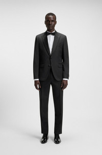 SIZE AND FIT The model wears a size 38R and is 6'1" tall with a, 35" chest, 30" waist and 35" hips. DETAILS H-Huge-Tux-P-B1 - 50469170 A tuxedo jacket in a defined fit, by BOSS Menswear. Crafted in serge-woven wool, this elegant piece features tonal silk-blend trims. Slim fit Peaked lapels Number of buttons: 2 Welt chest pockets Pockets top: Flap pockets Kissing buttons on the cuff Side vent Fully lined QUALITY & CARE INSTRUCTIONS Iron Low Heat Do Not Wash Quality: 100% Virgin wool, Lining: 65% Viscose, 35% Polyester, Facing: 78% Silk, 22% Polyester, Sleeve lining: 100% Viscose, pocketing: 100% Cotton Reduced Dry Clean Do Not Bleach Do Not Tumble Dry