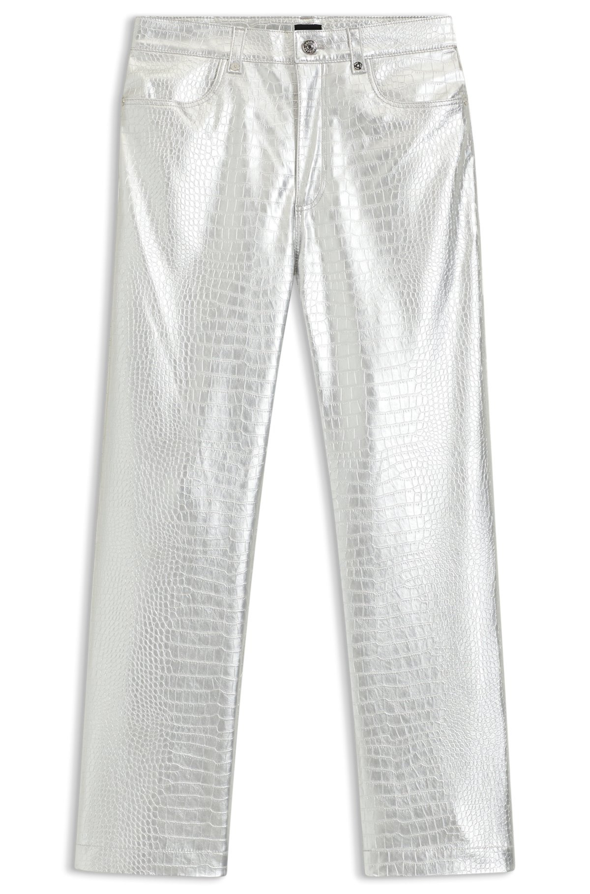 DETAILS C_Troco1 - 50535619 Metallic-effect trousers, cut with a straight leg, by BOSS Womenswear. This statement pair is crafted in synthetic coated fabric with crocodile embossing. Synthetic coated fabric, sometimes referred to as faux leather, is a fabric designed to resemble real leather, and/or display a matte, glossy, smooth, or textured, coated appearance. Regular fit Regular rise Button and zip closure Straight leg Pockets bottom front: Side slash pockets Pockets bottom back: Patch pocket Unlined QUALITY & CARE INSTRUCTIONS Do Not Tumble Dry Do Not Bleach Quality: 100% Polyester, pocketing: 65% Polyester, 35% Cotton Do Not Dry Clean Do Not Iron Machine Wash Cold Gentle