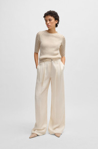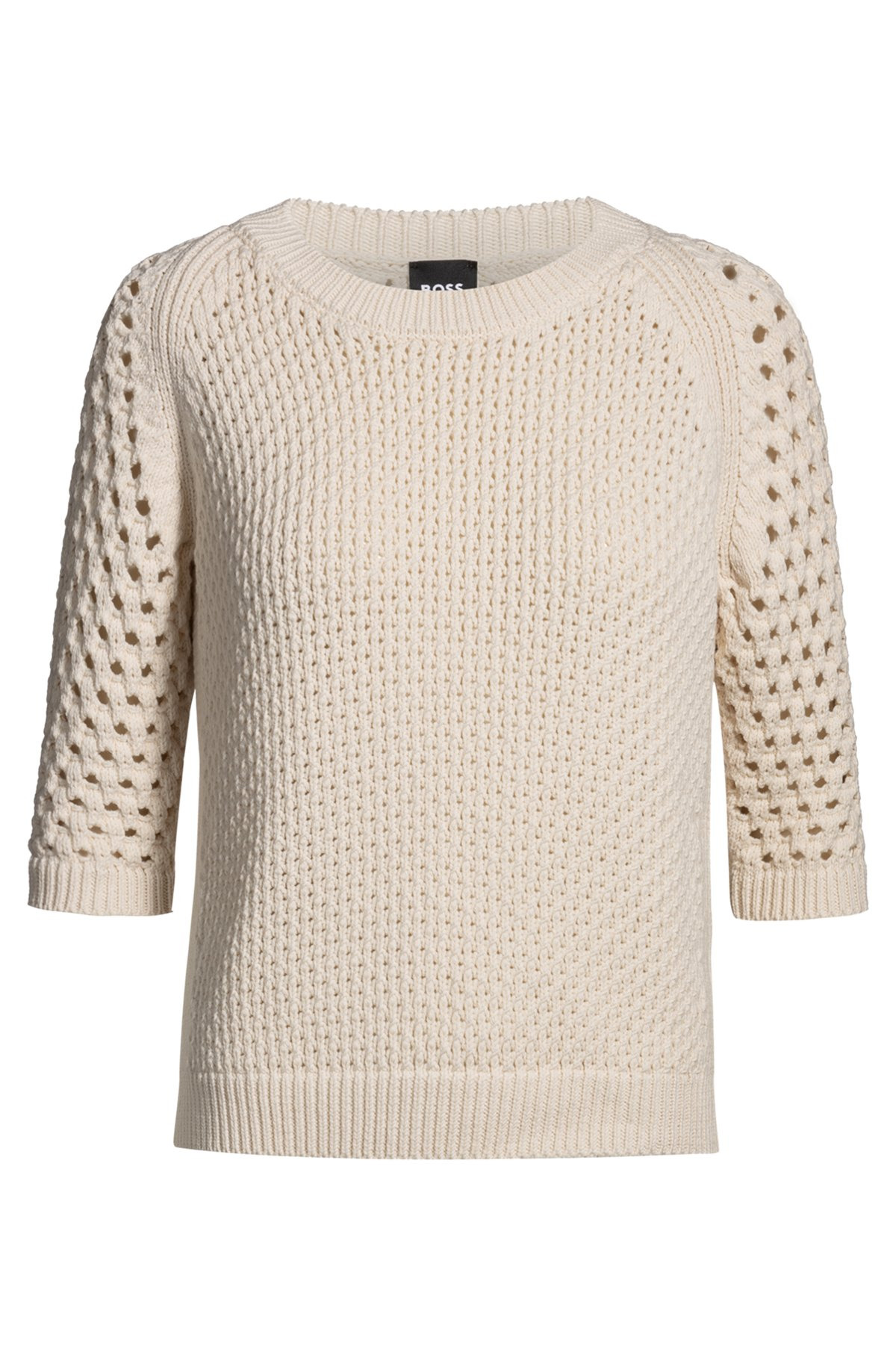 SIZE AND FIT The model wears a size S and is 5'10" tall with a, 31" chest, 24" waist and 35" hips. DETAILS Funima - 50534134 With an easy crew-neck shape, this BOSS Womenswear sweater is a fresh update for your summer wardrobe. Knitted with airy structures in soft yarn. QUALITY & CARE INSTRUCTIONS Reduced Dry Clean Do Not Bleach Hand Wash Only Do Not Tumble Dry Quality: 91% Cotton, 9% Polyester Iron Low Heat