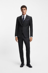 DETAILS Prepare for formal events with this three-piece BOSS Menswear suit. Crafted in wool with natural stretch for easy movement, this fully lined ensemble is tailored to a slim fit delivering a clean profile. The midweight fabric features a micro pattern that's easy to accessorize. Slim fit Notched lapels Fastening top: Button closure Number of buttons: 2 Jetted chest pockets Pockets top: Flap pockets Fully lined Hook and zip closure Pockets bottom front: Side slash pockets Pockets bottom back: Welt pocket H-Huge-3Pcs-253 - 50551771 QUALITY & CARE INSTRUCTIONS Reduced Dry Clean Do Not Bleach Material: 100% Virgin wool, Lining: 65% Viscose, 35% Polyester, Sleeve lining: 100% Viscose, pocketing: 65% Polyester, 35% Cotton, knee lining: 100% Viscose Iron Low Heat Do Not Tumble Dry Do Not Wash