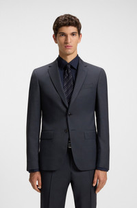 DETAILS Update your midweek tailoring with this refined two-piece BOSS Menswear suit. Crafted in 100% virgin wool with natural stretch, this suit has a subtle micro pattern that's easy to accessorize. Cut to a clean slim fit with constructed shoulders for a sharp silhouette. Slim fit Notched lapels Number of buttons: 2 Jetted chest pockets Pockets top: Flap pockets Kissing buttons on the cuff Fully lined Pockets bottom front: Side slash pockets Pockets bottom back: Welt pocket H-Huge-2Pcs-253 - 50551766 QUALITY & CARE INSTRUCTIONS Do Not Wash Do Not Bleach Quality: 100% Virgin wool, Lining: 95% Polyester, 5% Elastane, Sleeve lining: 100% Viscose, knee lining: 100% Viscose Reduced Dry Clean Iron Low Heat Do Not Tumble Dry