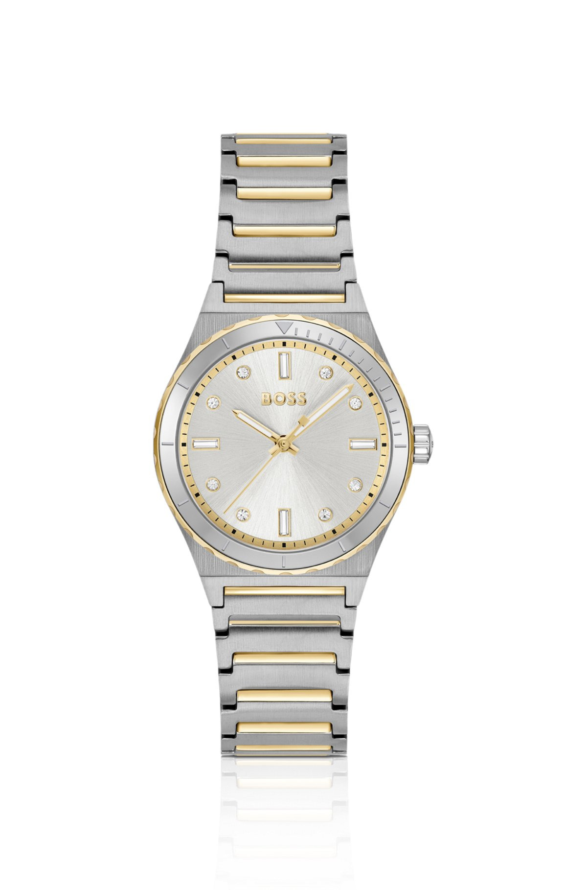 DETAILS CANDOR SPORT - 58244939 With an integrated bracelet, this BOSS Womenswear watch is made in golden and silver-effect steel. Shimmering dial with round and baguette-cut crystals. Watch mechanism: Three-hand Dial color: Silver-white Strap material: Stainless steel Closure: Push-button deployment Case size: 1.26 in (32 mm) (0 inches) Water Resistance (in ATM): 3 ATM QUALITY & CARE INSTRUCTIONS Quality: 100% Stainless steel