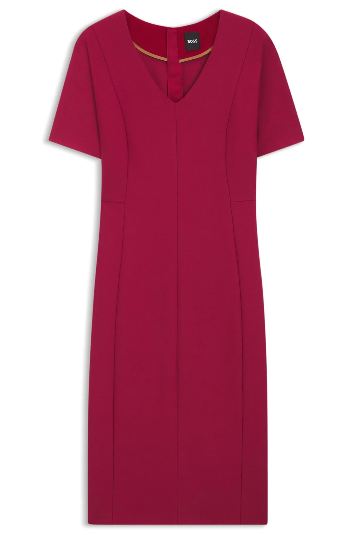 SIZE AND FIT The model wears a size 2 and is 5'9" tall with a, 32" chest, 23" waist and 35" hips. DETAILS A business essential for enduring style, this BOSS Womenswear dress is crafted with stretch for comfort and a flattering fit. Travel-friendly crease-resistant fabric. Slim fit Neckline: V-neck Fastening top: Zip closure Short sleeves Back slit Unlined Fit back length: 100 cm (39 inches) Damaisa - 50490044 QUALITY & CARE INSTRUCTIONS Do Not Tumble Dry Iron Low Heat Do Not Bleach Reduced Dry Clean Cold, gentle machine wash; reduced spin speed. Quality: 67% Viscose, 29% Polyester, 4% Elastane, Facing: 100% Cotton