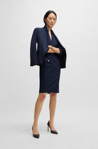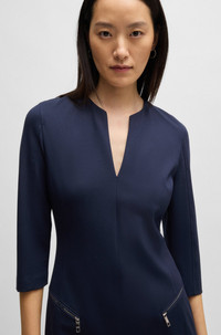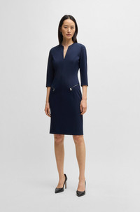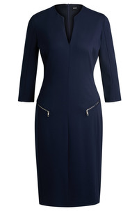 SIZE AND FIT The model wears a size 2 and is 5'10" tall with a, 31" chest, 23" waist and 35" hips. DETAILS Dalmar - 50530906 A form-fitting dress with smooth lining by BOSS Womenswear. This V-neck piece features cropped sleeves and zipped diagonal pockets. Slim fit Fastening top: Zip closure 3/4 sleeves Pockets top: Zip pockets Fully lined Fit back length: 100 cm (39 inches) QUALITY & CARE INSTRUCTIONS Do Not Tumble Dry Do Not Wash Do Not Bleach Quality: 65% Viscose, 30% Polyamid, 5% Elastane, Lining: 54% Viscose, 43% Polyamid, 3% Elastane Iron Low Heat Reduced Dry Clean
