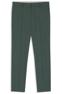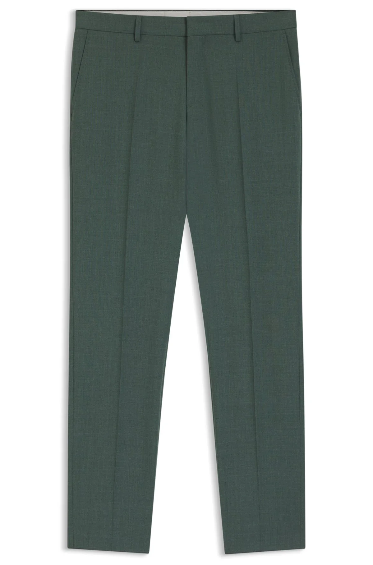 DETAILS With added stretch for comfort, these easy-care BOSS Menswear trousers are cut in washable fabric blended with virgin wool. Slim fit Straight leg Slim fit Hook and zip closure Straight leg Pockets bottom front: French pocket Pockets bottom back: Welt pocket Partially lined H-Genius-253 - 50557329 QUALITY & CARE INSTRUCTIONS Do Not Bleach Do Not Wash Iron Low Heat Reduced Dry Clean Material: 52% Polyester, 43% Virgin wool, 5% Elastane, pocketing: 65% Polyester, 35% Cotton, knee lining: 100% Viscose Do Not Tumble Dry