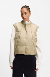 SIZE AND FIT The model wears a size 4 and is 5'9" tall with a, 32" chest, 23" waist and 35" hips. DETAILS Featuring wadding with sleek front paneling, this regular-fit BOSS Womenswear gilet will warm your core in style. Water-repellent finish. Regular fit Stand collar Fastening top: Press-stud closure Number of buttons: 4 or more buttons Pockets top: Welt pockets Standard length Fit back length: 55 cm (22 inches) Pia - 50551835 QUALITY & CARE INSTRUCTIONS Iron Low Heat Do Not Bleach Machine Wash Cold Gentle Tumble Dry Low Heat Do Not Dry Clean Material: 100% Polyamide, Lining: 100% Polyamide, Wadding: 100% Polyester