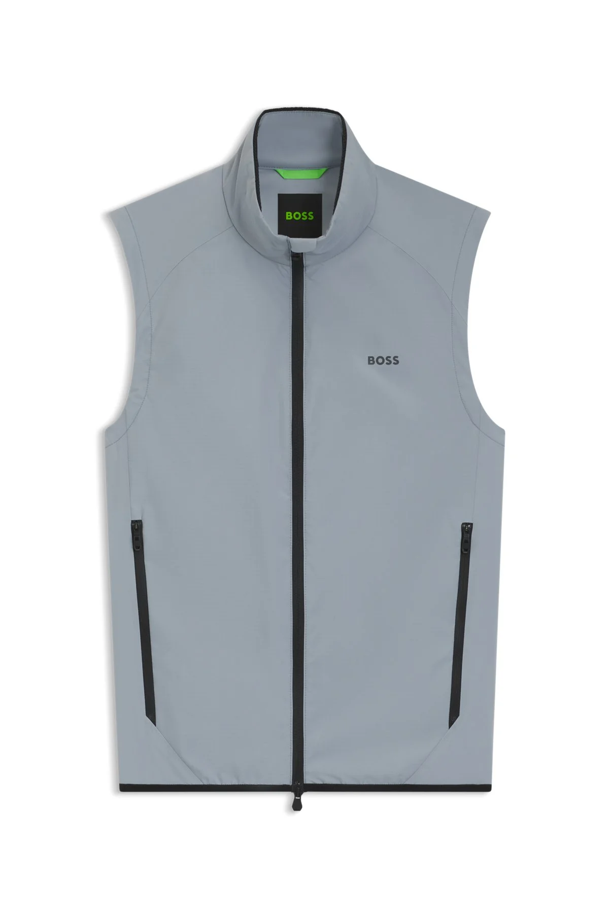 DETAILS V_Putt - 50533761 This BOSS Menswear golf vest offers protection when it rains and secure storage for valuables. Versatile two-way zip. Elasticated hem. Decorative reflective details. Regular fit Stand collar Fastening top: Zip closure Unlined Fit back length: 73 cm (29 inches) QUALITY & CARE INSTRUCTIONS Quality: 100% Elastomultiester, Front panel: 100% Polyester Do Not Tumble Dry Do Not Dry Clean Iron Low Heat Machine Wash Cold Gentle Do Not Bleach