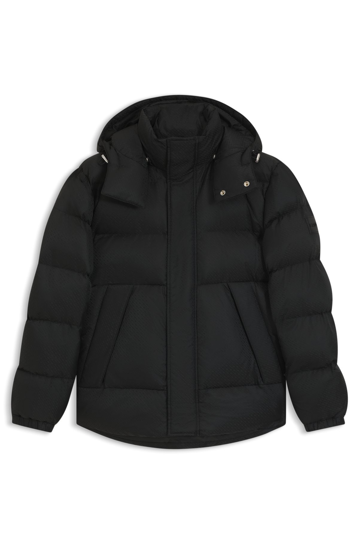 SIZE AND FIT The model wears a size 40R and is 6'1" tall with a, 36" chest, 29" waist and 37" hips. DETAILS Protective and cozy, this BOSS Menswear jacket is made in water-repellent fabric with distinctive micro monograms. Logo badge on left sleeve. Fit back length: 74 cm (29 inches) H-Corbinian5 - 50548727 QUALITY & CARE INSTRUCTIONS Do Not Dry Clean very mild professional wet clean Do Not Wash Do Not Tumble Dry Do Not Bleach Iron Low Heat Material: 100% Polyamide, Lining: 100% Polyamid, Filling: 100% Polyester, Wadding: 100% Polyester