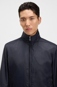 DETAILS C-Casamu - 50540458 Patterned with a micro-monogram jacquard, this BOSS Menswear jacket offers rain protection with contemporary style. Ribbed trims. Double B monogram trim. Regular fit Stand collar Fastening top: Zip closure Pockets top: Welt pockets Inside zip pockets Adjustable cuffs Fully lined Standard length Fit back length: 65 cm (26 inches) QUALITY & CARE INSTRUCTIONS Do Not Dry Clean Quality: 100% Polyamide, Lining: 100% Polyamide, Knitwear: 87% Polyester, 12% Polyamid, 1% Elastane Iron Low Heat Do Not Bleach Machine Wash Cold Gentle Tumble Dry Low Heat