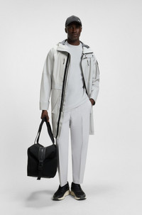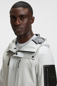 SIZE AND FIT The model wears a size M and is 6'0" tall with a, 36" chest, 31" waist and 35" hips. DETAILS J_Explorer Coat HD - 50541051 With a water-resistant two-way zip and sealed seams, this BOSS Menswear parka jacket will deliver in unpredictable weather. Adjustable hood. Multiple secure pockets. Relaxed fit Hooded collar Fastening top: Zip and button closure Zip chest pockets Pockets top: Zip pockets Unlined Long length Fit back length: 100 cm (39 inches) QUALITY & CARE INSTRUCTIONS Do Not Tumble Dry Machine Wash Cold Gentle very mild professional wet clean Iron Low Heat Quality: 100% Polyamid Do Not Bleach Do Not Dry Clean