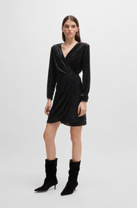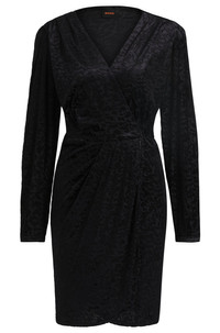 SIZE AND FIT The model wears a size S and is 5'10" tall with a, 31" chest, 24" waist and 35" hips. DETAILS C_Edevoras - 50524157 A feminine wrap-front dress in stretch jersey by BOSS. Featuring a semi-transparent burnout effect, this long-sleeved style has detachable shoulder pads. QUALITY & CARE INSTRUCTIONS Do Not Bleach Do Not Tumble Dry Quality: 45% Polyamid, 43% Polyester, 12% Elastane, Lining: 100% Cotton Do Not Dry Clean Iron Low Heat Machine Wash Cold Gentle