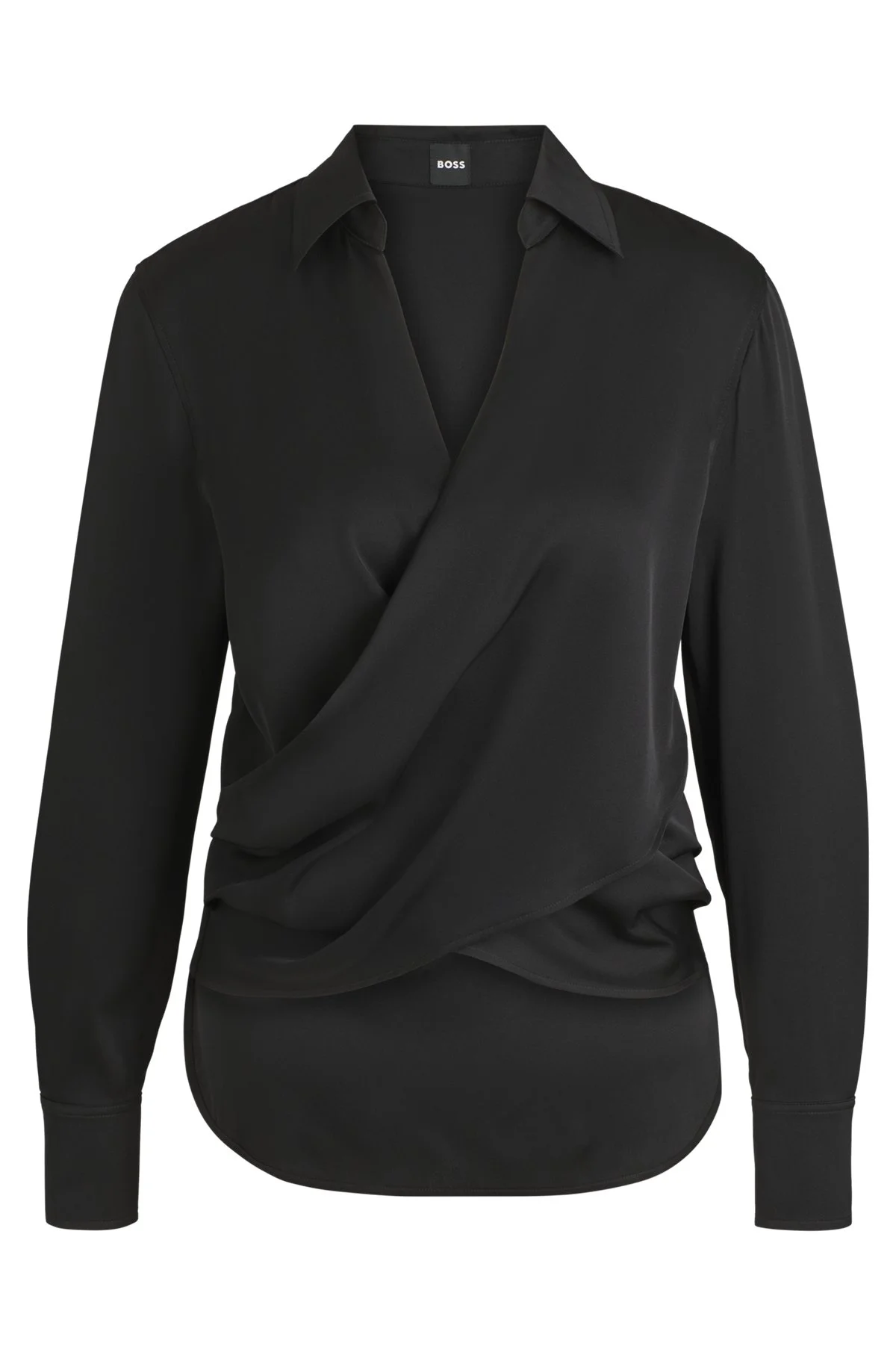 DETAILS Belidana - 50537637 The dipped back hem and wrap front of this BOSS Womenswear blouse create a contemporary look. Pointed-collar detail. Drapey stretch silk. Point collar Long sleeves Button cuffs QUALITY & CARE INSTRUCTIONS Do Not Wash Do Not Bleach Do Not Tumble Dry Reduced Dry Clean Quality: 90% Silk, 10% Elastane Iron Low Heat