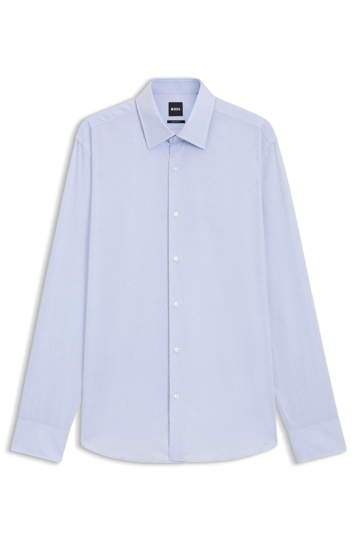 DETAILS Woven with a subtle quilted effect and offering reliable wrinkle control, this BOSS Menswear shirt is a business essential. Soft cotton. Straight fit. Regular fit Kentkragen Angled cuffs H-JOE-K-C2-261 - 50556499 QUALITY & CARE INSTRUCTIONS Machine Wash Warm Material: 100% Cotton Do Not Bleach Dry Clean Only Do Not Tumble Dry Iron Medium Heat