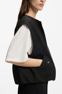 DETAILS Ideal when paired with the matching bottoms, this BOSS Womenswear waistcoat is a formal must. Soft twill with stretch. Zip front and rear box pleat. Relaxed fit Fastening top: Zip closure Pockets top: Flap pockets Fully lined C_Jakora - 50554857 QUALITY & CARE INSTRUCTIONS Material: 63% Polyester, 34% Viscose, 3% Elastane, Sleeve lining: 55% Polyester, 45% Viscose Iron Low Heat Do Not Bleach Do Not Wash Do Not Tumble Dry Reduced Dry Clean