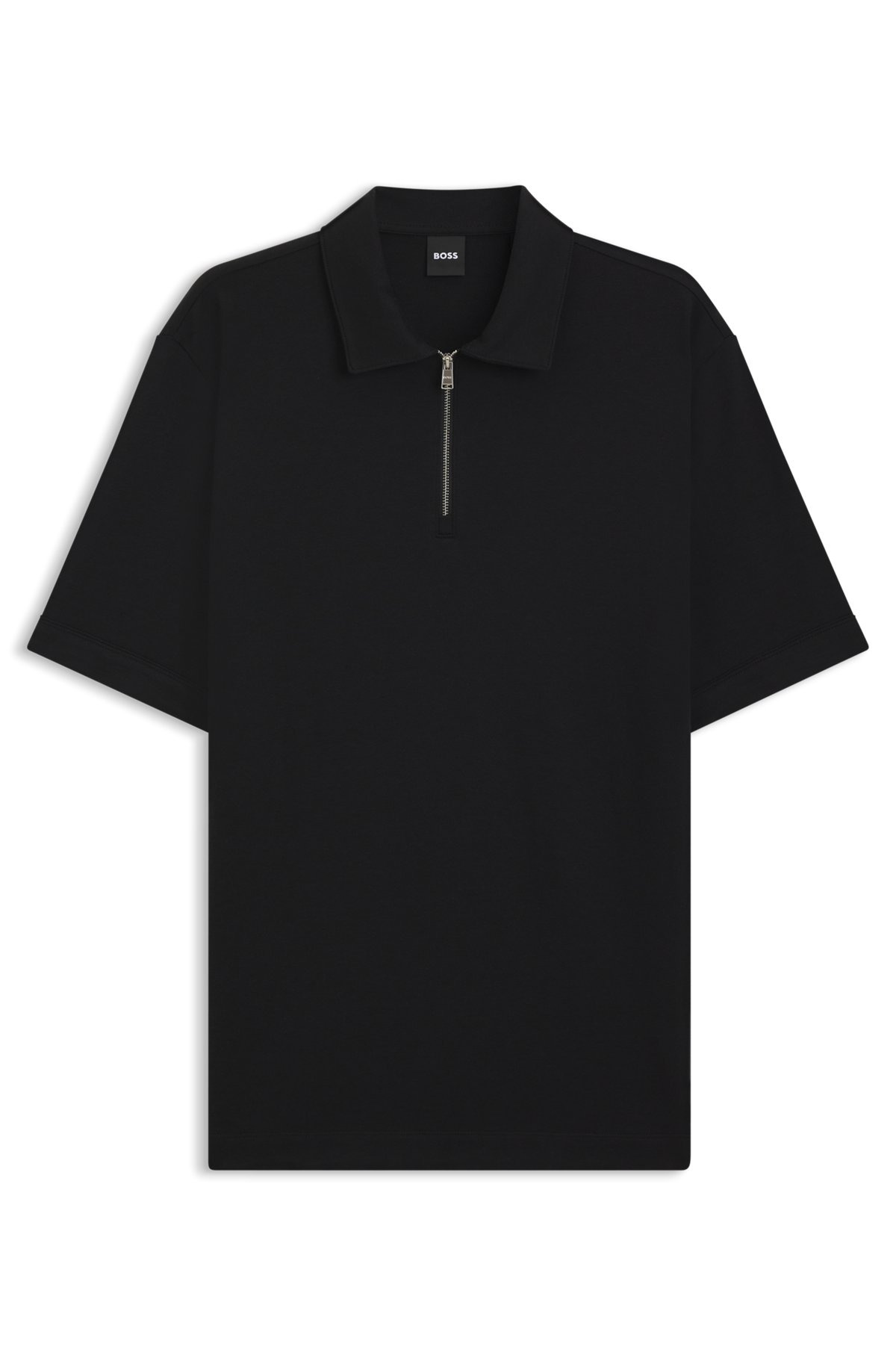 DETAILS H-Paras 57 - 50544091 Topped with a zip placket, this straight-fit BOSS Menswear polo shirt is a casual classic. Breathable pique weave. Blended with soft cotton. Regular fit Neckline: Zip neck Short sleeves Standard length QUALITY & CARE INSTRUCTIONS Cold, gentle machine wash; reduced spin speed. Do Not Tumble Dry Quality: 67% Lyocell, 33% Cotton Iron Low Heat Do Not Bleach Do Not Dry Clean
