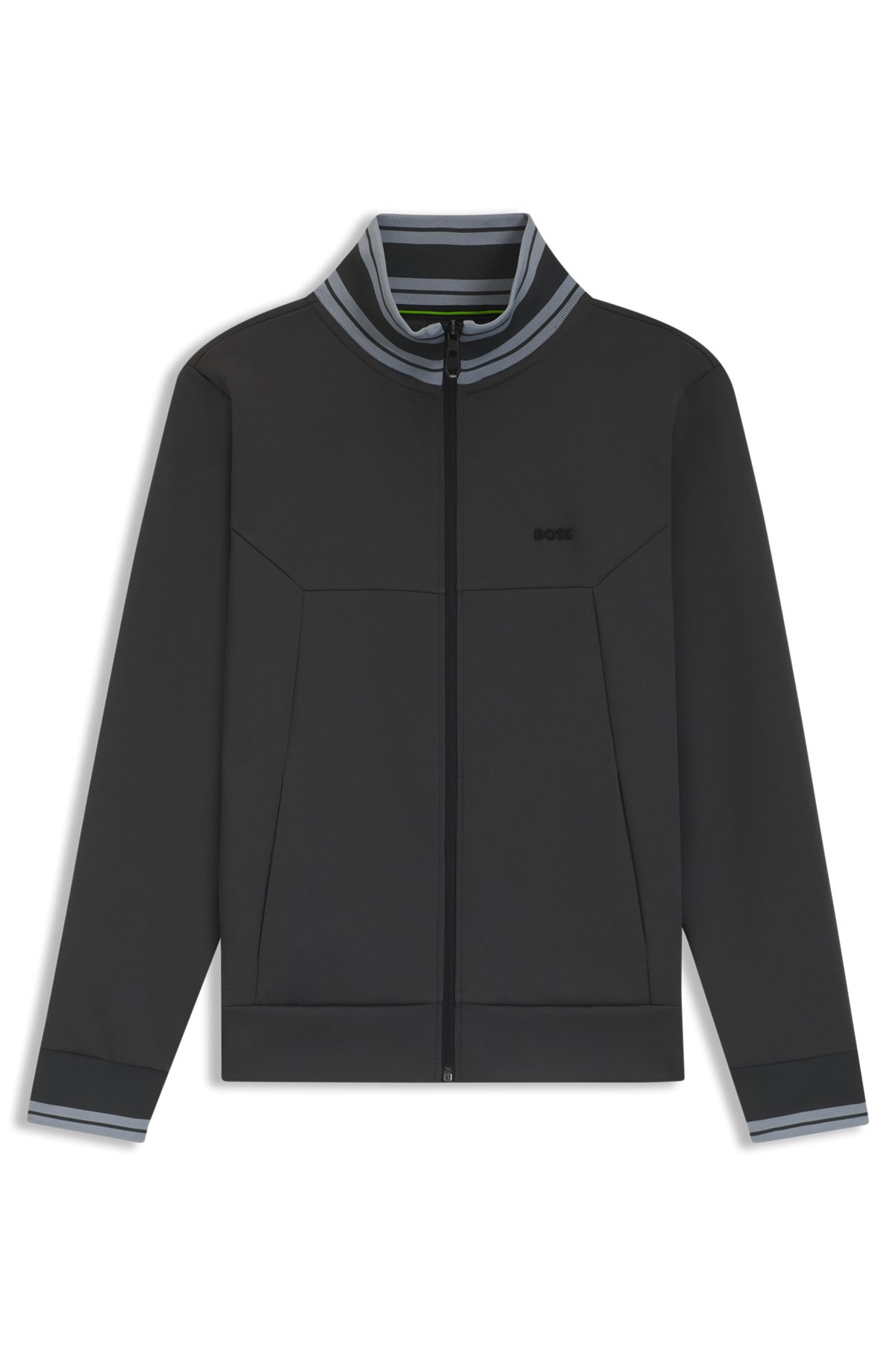 DETAILS FZ Zone - 50543081 In a straight fit, this BOSS Menswear zipped sweatshirt offers an easy-wear layer. Cotton with stretch. Punctuated by stripes and a molded logo. Regular fit Neckline: Ribbed collar Fastening top: Zip closure Pockets top: Side-entry pockets Long sleeves Ribbed cuffs Standard length QUALITY & CARE INSTRUCTIONS Do Not Bleach Do Not Dry Clean Machine Wash Cold Gentle Quality: 62% Cotton, 33% Polyester, 5% Elastane, pocketing: 100% Polyester Do Not Tumble Dry Iron Low Heat