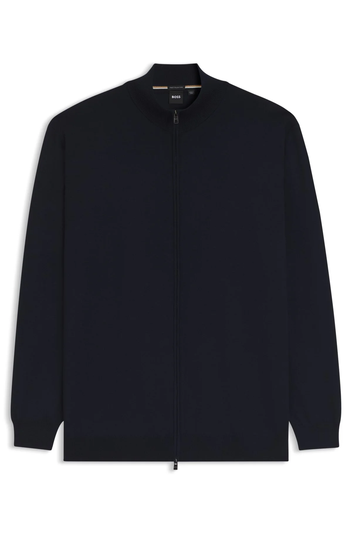 DETAILS Featuring a two-way front zipper, this BOSS Menswear cardigan is knitted in extra-fine merino wool for natural temperature control. Casual regular fit. Regular fit Neckline: Zip neck Long sleeves Standard length Balonso_B&T - 50560668 QUALITY & CARE INSTRUCTIONS Do Not Bleach Dry Clean Only Do Not Tumble Dry Cold, gentle machine wash; reduced spin speed. Iron Medium Heat Material: 100% Virgin wool