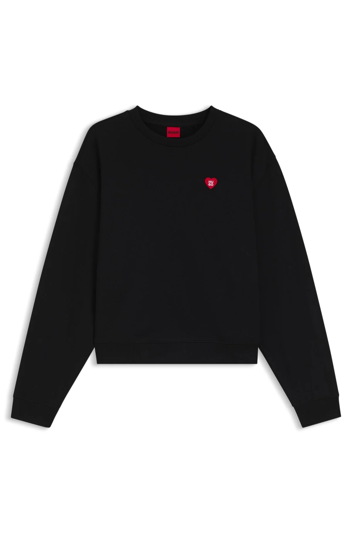 SIZE AND FIT Relaxed fit The model wears a size L and is 5'9" tall with a, 0" chest, 23" waist and 35" hips. DETAILS Featuring a heart-shaped logo at the chest, this all-gender HUGO sweatshirt adds a playful vibe to casual looks. Straight fit. Soft cotton terry. Relaxed fit Neckline: Crew neck Long sleeves Ribbed cuffs Standard length Deroxina_7 - 50555808 QUALITY & CARE INSTRUCTIONS Iron Low Heat Do Not Tumble Dry Material: 100% Cotton Do Not Bleach Machine Wash Cold Gentle Do Not Dry Clean