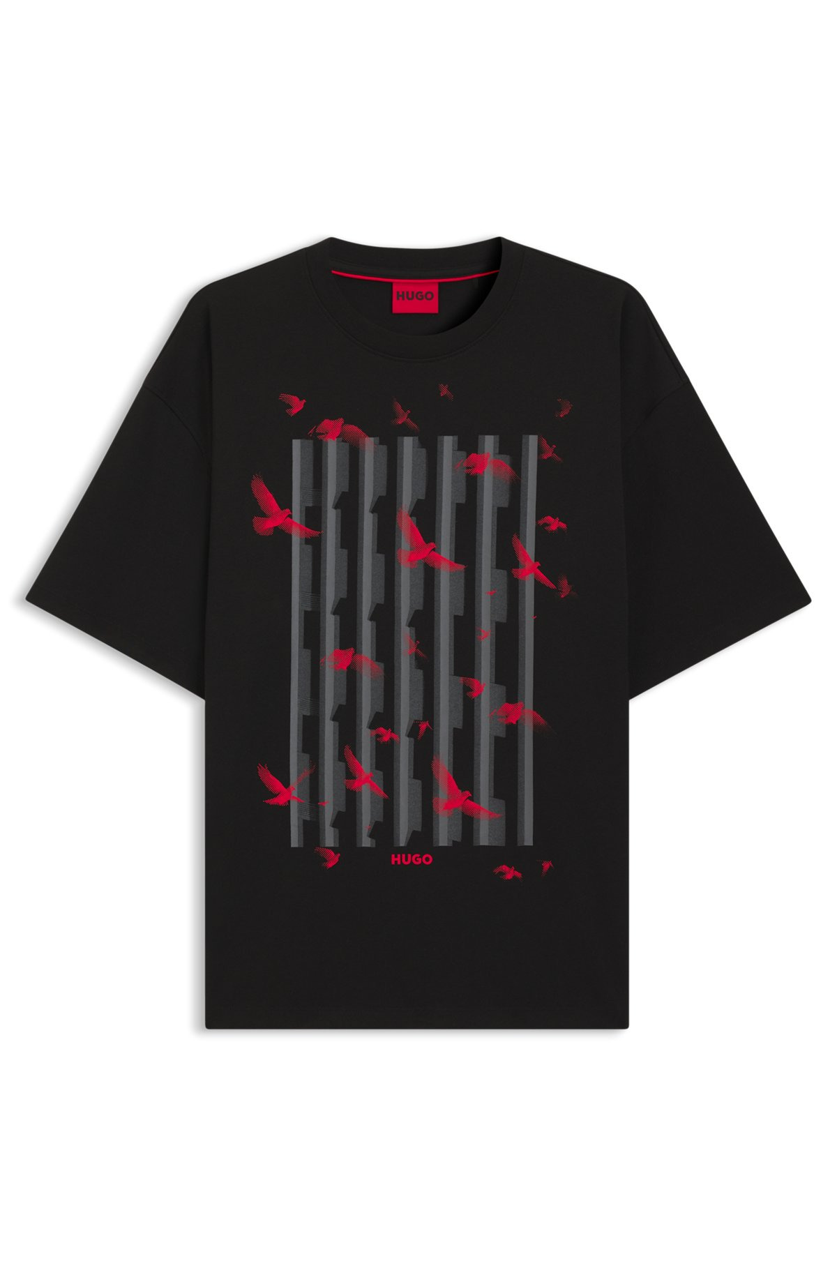 DETAILS Digraph - 50542581 Cut to a roomy fit, this HUGO Menswear T-shirt carries creative bird artwork to refresh casual looks. Crafted in soft cotton jersey. Oversized fit Neckline: Crew neck Short sleeves QUALITY & CARE INSTRUCTIONS Do Not Tumble Dry Machine Wash Cold Gentle Quality: 100% Cotton Iron Low Heat Do Not Bleach Do Not Dry Clean