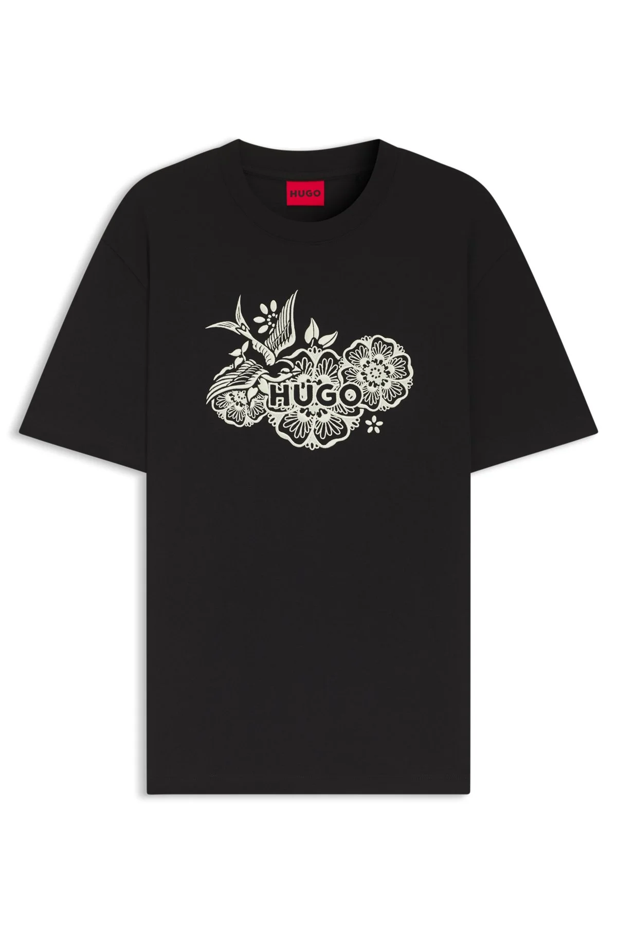 SIZE AND FIT Relaxed fit The model wears a size M and is 6'2" tall with a, 35" chest, 27" waist and 35" hips. DETAILS Featuring intricate embroidered logo artwork, this HUGO Menswear T-shirt is crafted in comfortable cotton jersey. Cut to a relaxed fit. Relaxed fit Neckline: Crew neck Short sleeves Dangen - 50558415 QUALITY & CARE INSTRUCTIONS Iron Low Heat Material: 100% Cotton Do Not Bleach Reduced Dry Clean Do Not Tumble Dry Machine Wash Cold Gentle