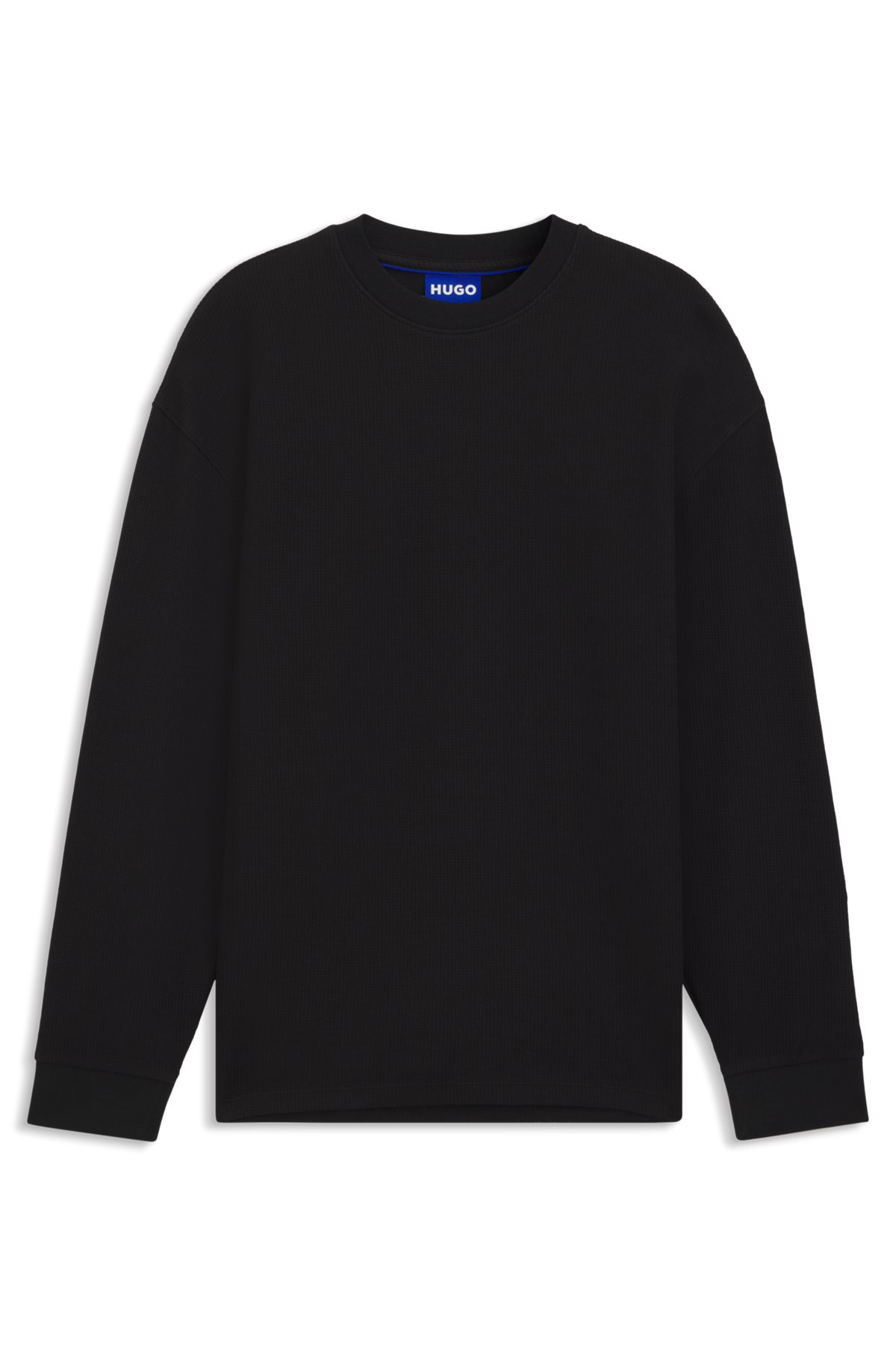 SIZE AND FIT The model wears a size M and is 6'2" tall with a, 35" chest, 27" waist and 35" hips. DETAILS Nuwolo - 50534454 With a logo-badge trim, this HUGO Menswear T-shirt is woven with a special waffle structure for textural appeal. Loose fit. Cotton rich. loose fit Neckline: Crew neck Long sleeves QUALITY & CARE INSTRUCTIONS Do Not Tumble Dry Machine Wash Cold Gentle Quality: 87% Cotton, 13% Polyamid Reduced Dry Clean Iron Low Heat Do Not Bleach