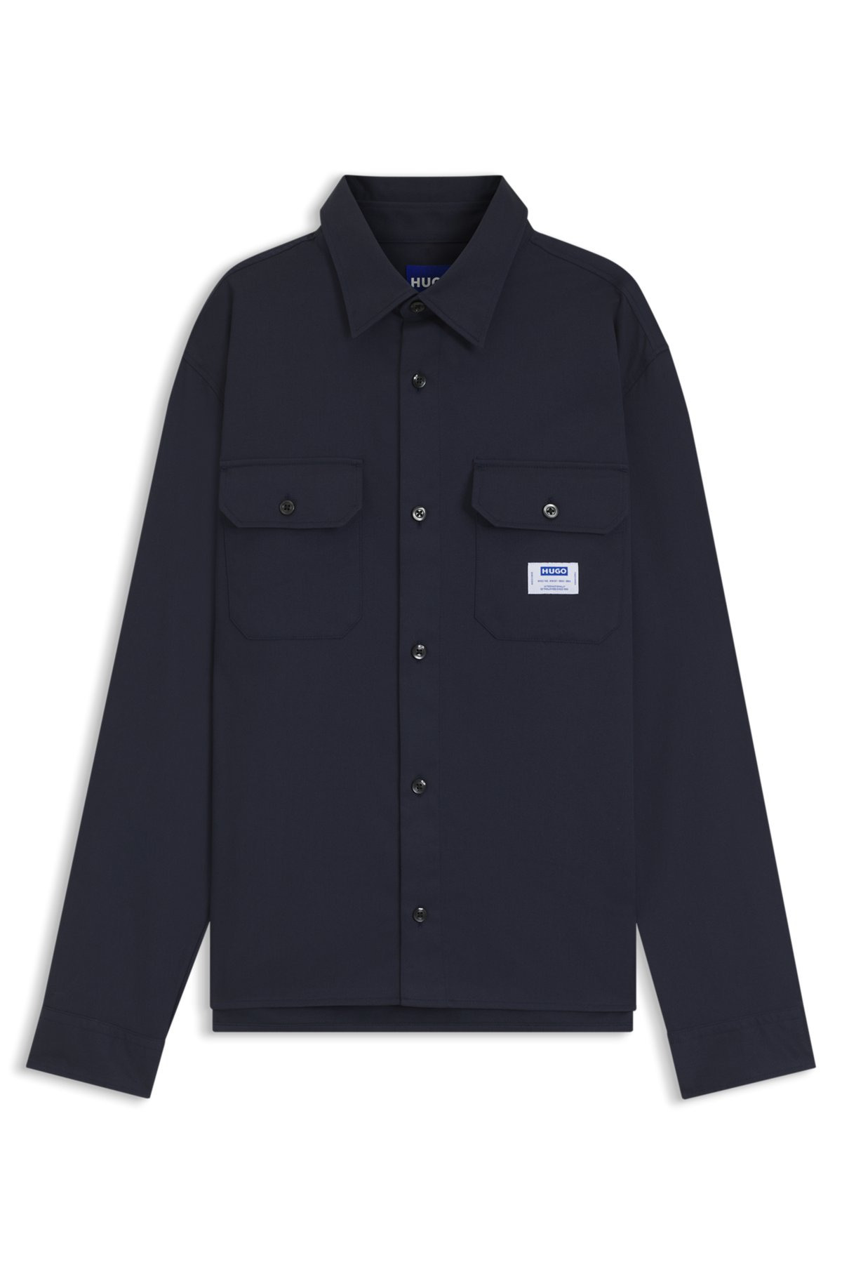 SIZE AND FIT The model wears a size M and is 6'2" tall with a, 35" chest, 27" waist and 35" hips. DETAILS Ekynone - 50520001 A signature shirt by HUGO Menswear, featuring a special logo label. Crafted in cotton twill, this piece is topped with a Kent collar. Oversized fit Kentkragen Flap chest pockets Barrel cuffs Short length Fit back length: 72 cm (28 inches) QUALITY & CARE INSTRUCTIONS Do Not Tumble Dry Quality: 100% Cotton Iron Low Heat Do Not Bleach Machine Wash Cold Do Not Dry Clean