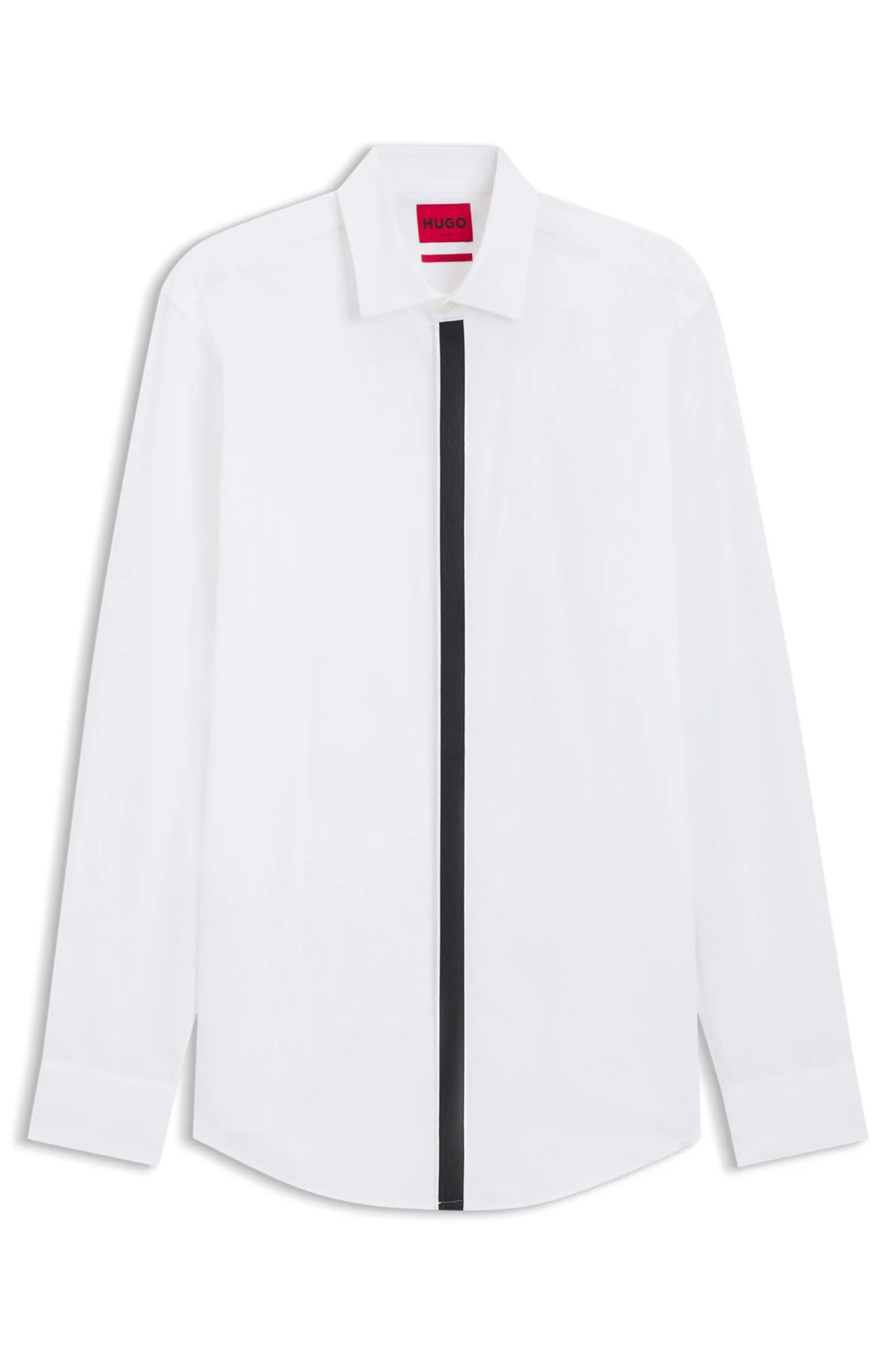 SIZE AND FIT The model wears a size 15.5 and is 6'2" tall with a, 34" chest, 29" waist and 35" hips. DETAILS In cotton poplin that's easy to iron, this HUGO Menswear shirt will work for business to evening looks. Concealed patterned placket. Slim fit. Slim fit Kentkragen Barrel cuffs Standard length Keidi - 50549775 QUALITY & CARE INSTRUCTIONS Iron Low Heat Do Not Bleach Machine Wash Cold Do Not Tumble Dry Material: 100% Cotton Do Not Dry Clean