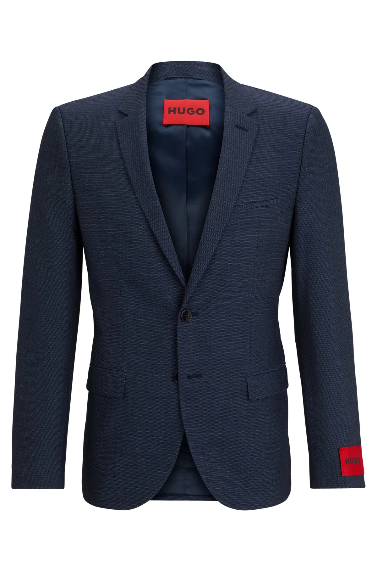 SIZE AND FIT The model wears a size 38R and is 6'1" tall with a, 36" chest, 27" waist and 35" hips. DETAILS ArtiM204X - 50495628 A super-stretch tailored jacket by HUGO Menswear, cut to an extra-slim fit in twill blended with virgin wool for richness. Extra-slim fit Notched lapels Number of buttons: 2 Welt chest pockets Pockets top: Flap pockets Side vent Fully lined Fit back length: 71 cm (28 inches) QUALITY & CARE INSTRUCTIONS Quality: 53% Polyester, 43% Virgin wool, 4% Elastane, Lining: 95% Polyester, 5% Elastane, Sleeve lining: 95% Polyester, 5% Elastane Do Not Tumble Dry Do Not Bleach Do Not Wash Iron Low Heat Reduced Dry Clean