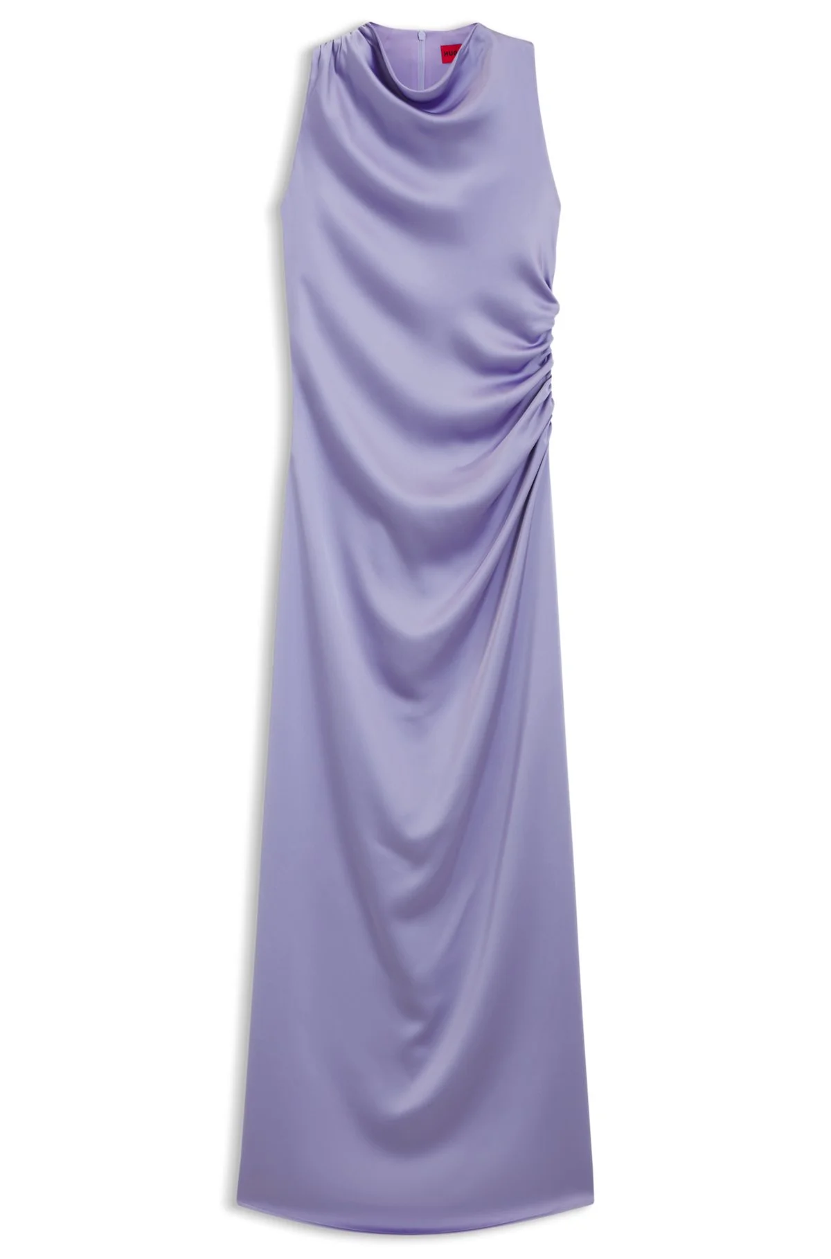 SIZE AND FIT The model wears a size 4 and is 5'10" tall with a, 30" chest, 23" waist and 33" hips. DETAILS With a sharp fit and maxi length, this HUGO Womenswear dress is effortlessly elegant. Soft satin with feminine gathering details. sharp fit Fastening top: Concealed closure Sleeveless Side slit Partially lined Fit back length: 146 cm (57 inches) Kesina-1 - 50553026 QUALITY & CARE INSTRUCTIONS Iron Low Heat Do Not Bleach Material: 100% Polyester (51% recycled), Lining: 100% Polyester Machine Wash Cold Gentle Do Not Tumble Dry Reduced Dry Clean